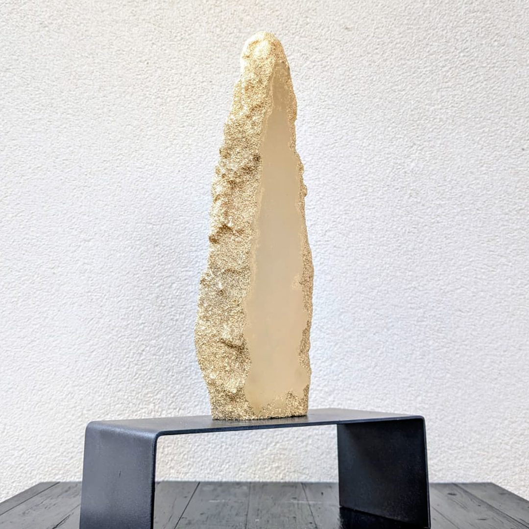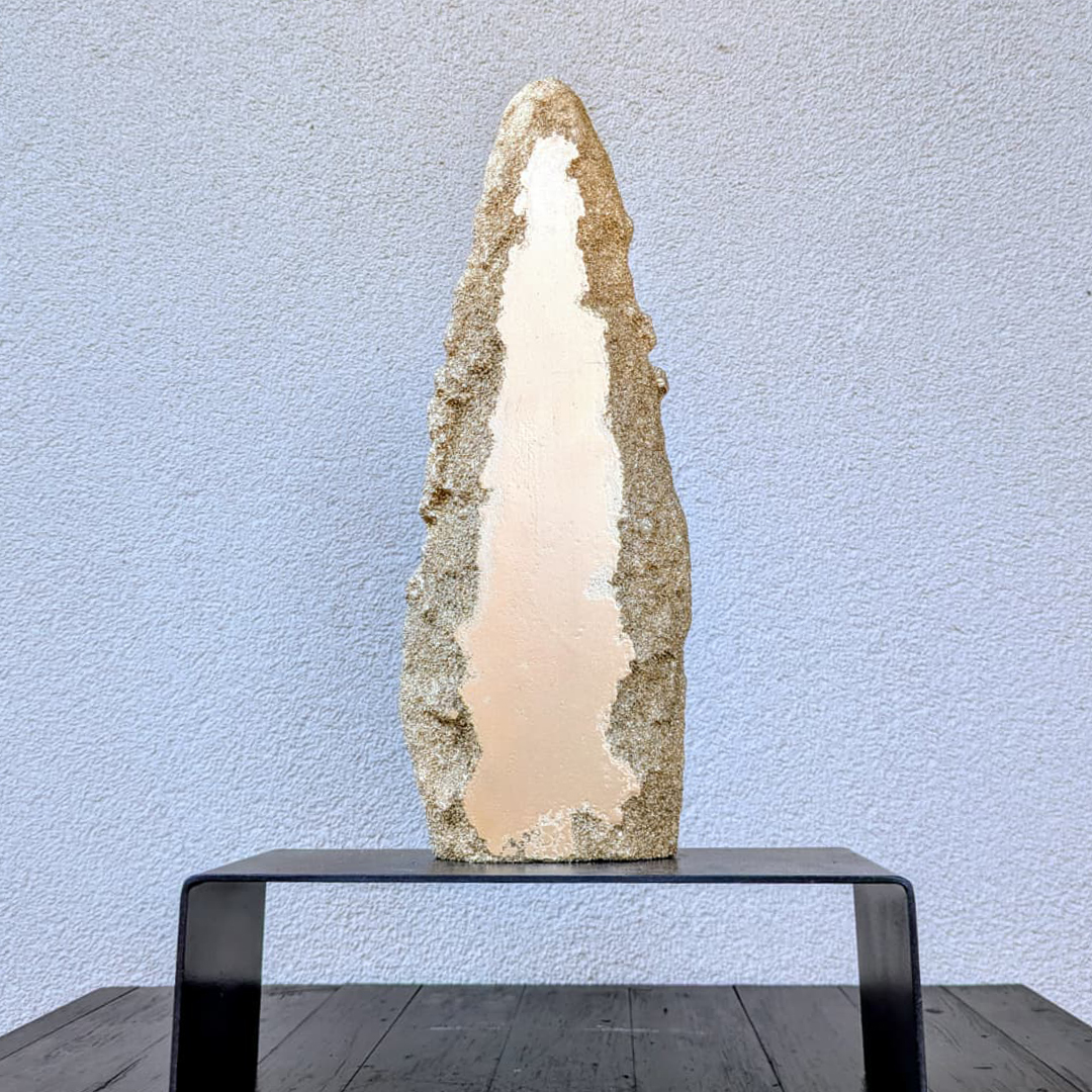 Scultura dalla forma archetipica che richiama i monoliti rituali, ponte tra arcaico e contemporaneo. La superficie, animata da texture geologiche, racconta di una memoria ancestrale che si rinnova nel presente. Opera nata dalla ricerca processuale e dal desiderio di esplorare il dialogo tra materia e tempo